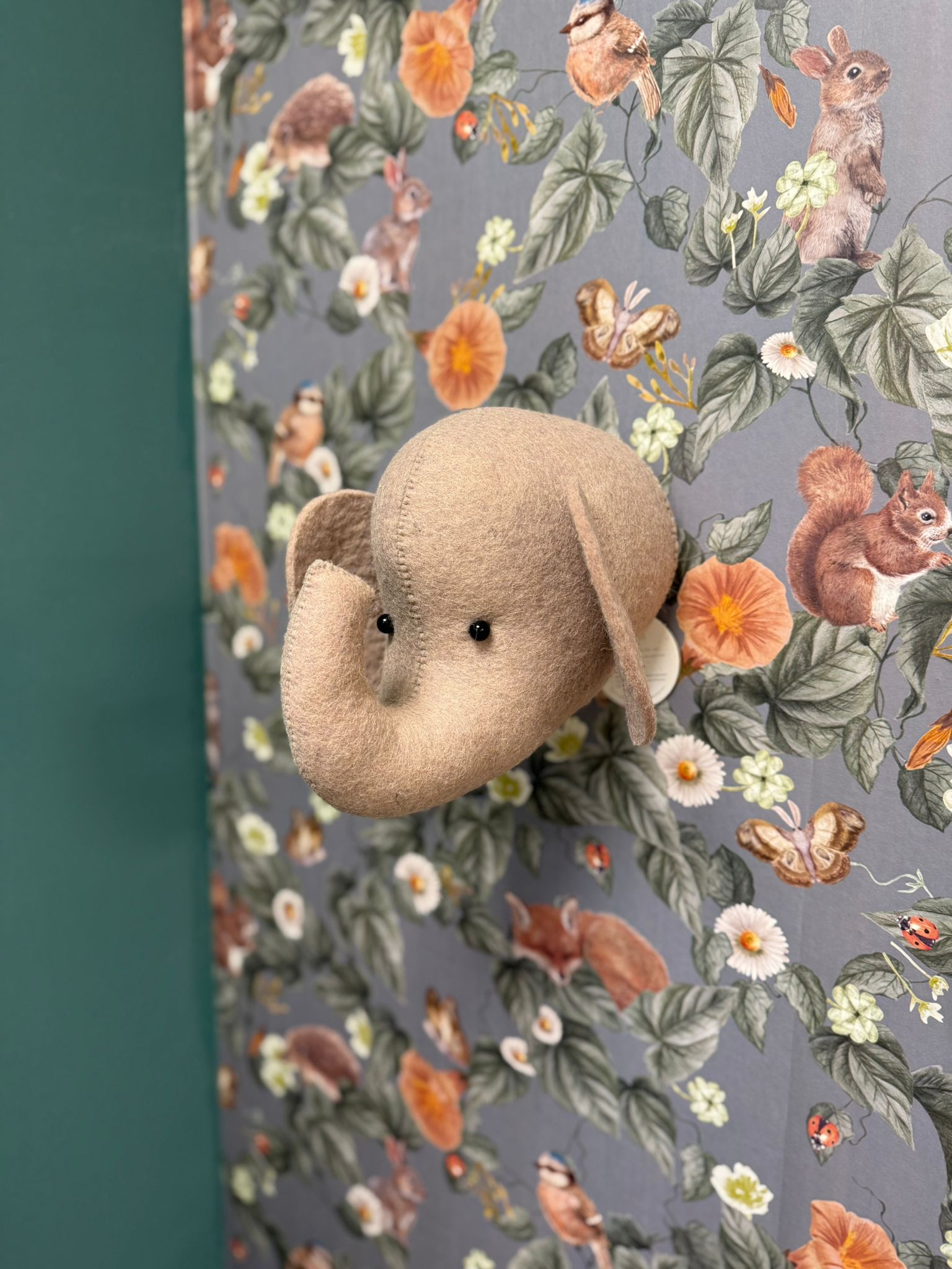 • Mini wall-mounted felt elephant head with a friendly raised trunk