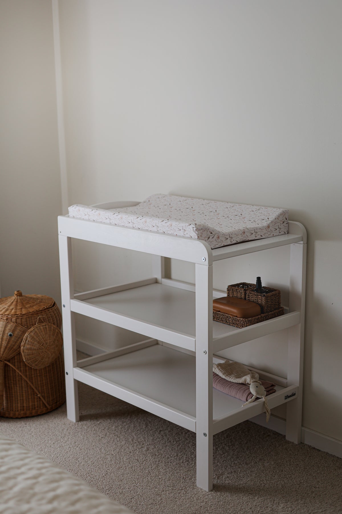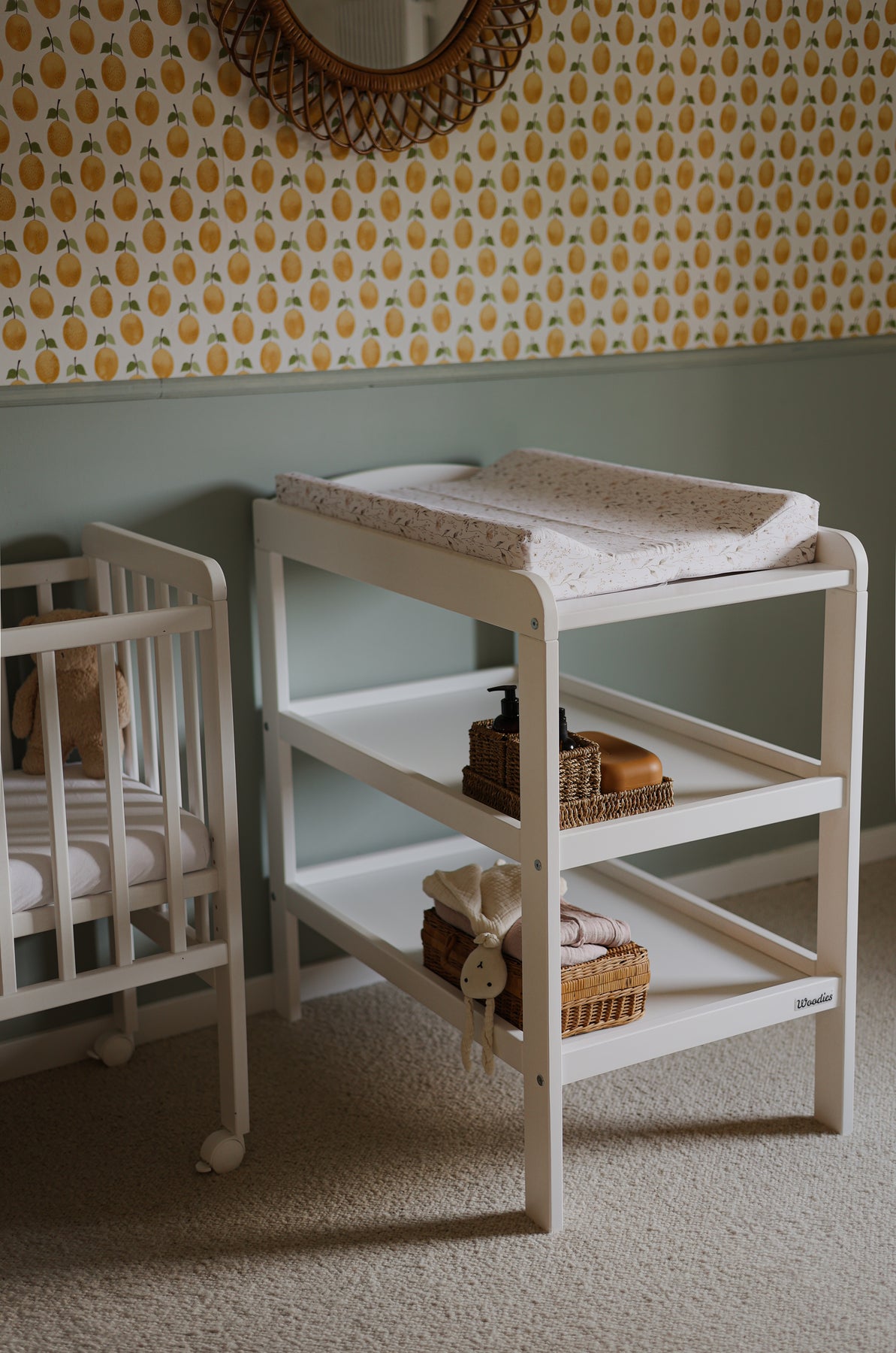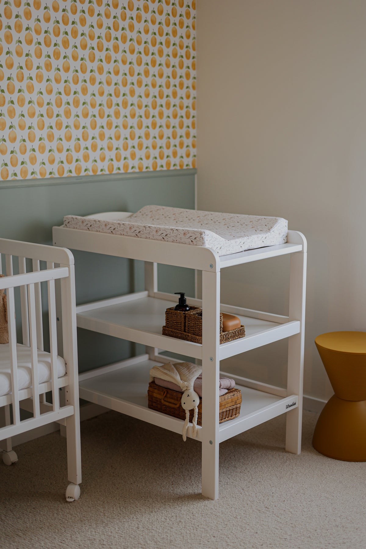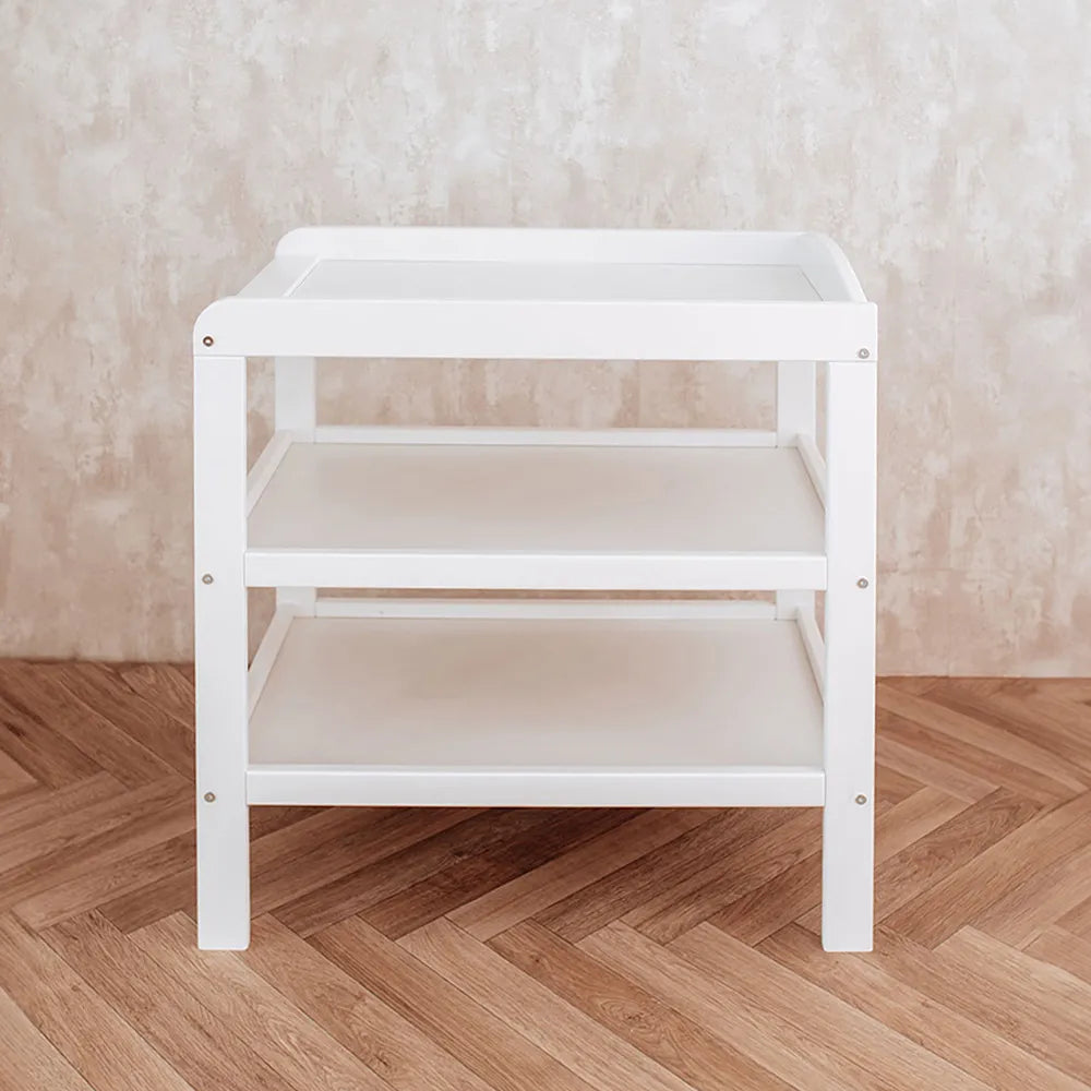 Rendez les changes plus sereins et plus doux pour votre dos grâce à cette table à langer blanche autoportante. Sa hauteur ergonomique et ses étagères ouvertes gardent lingettes et couches à portée de main, tout en apportant un style intemporel, parfaitement adapté à la chambre de bébé.