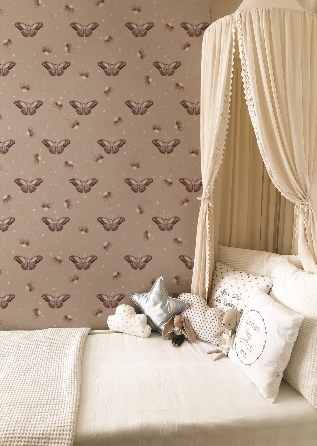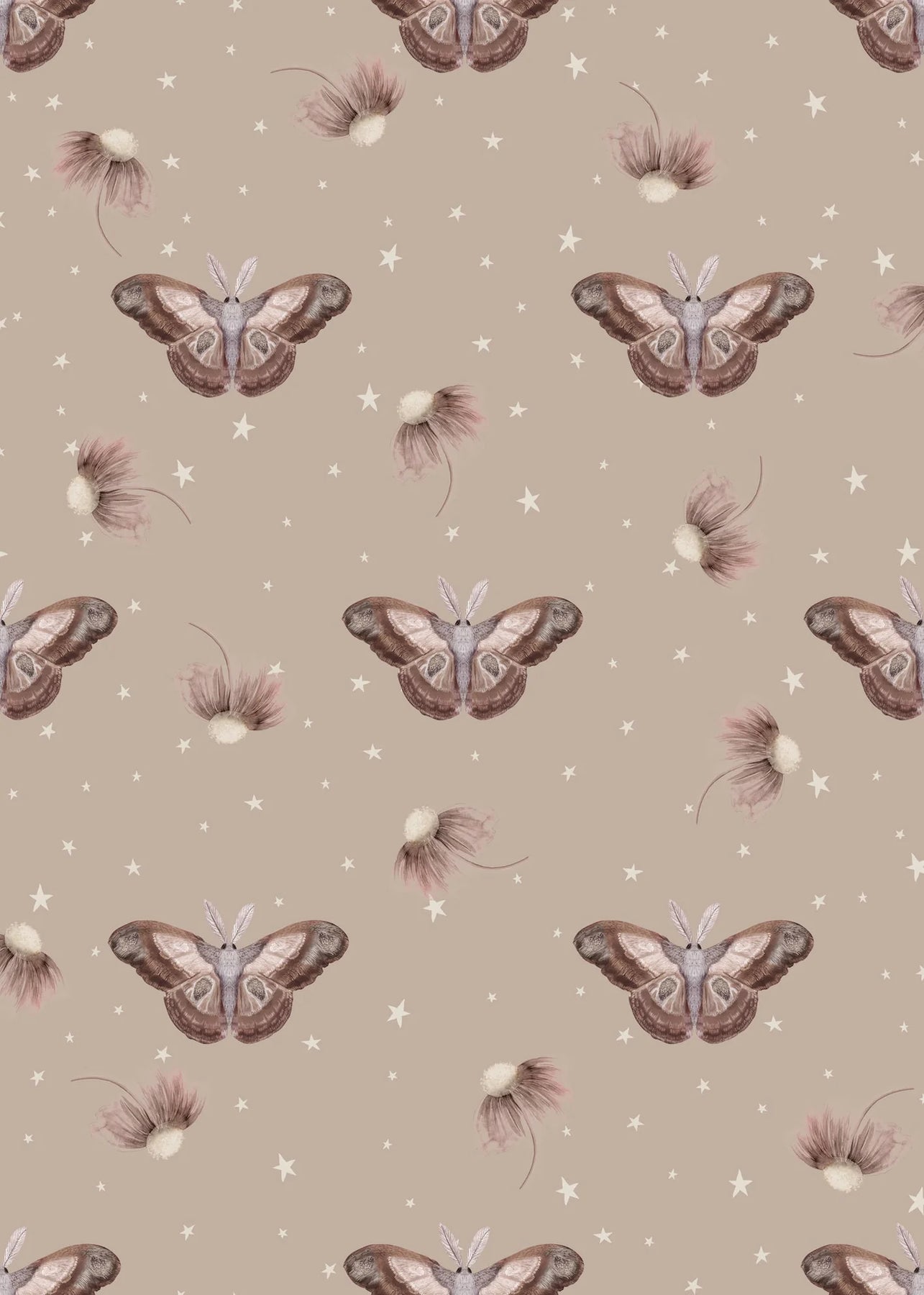 Insufflez une lueur de conte de fées dans la chambre de bébé ou d'enfant grâce à ce papier peint peint à la main, constellé d'étoiles scintillantes et de papillons de nuit magiques - un décor onirique qui stimule l'imagination des tout-petits.