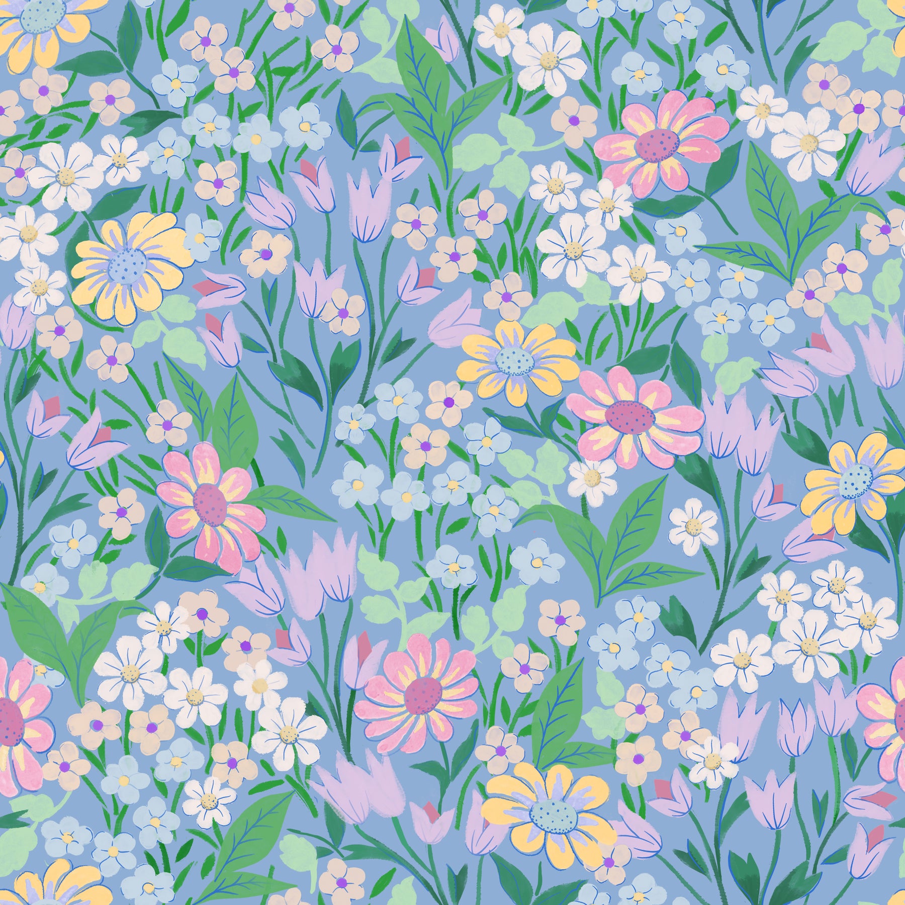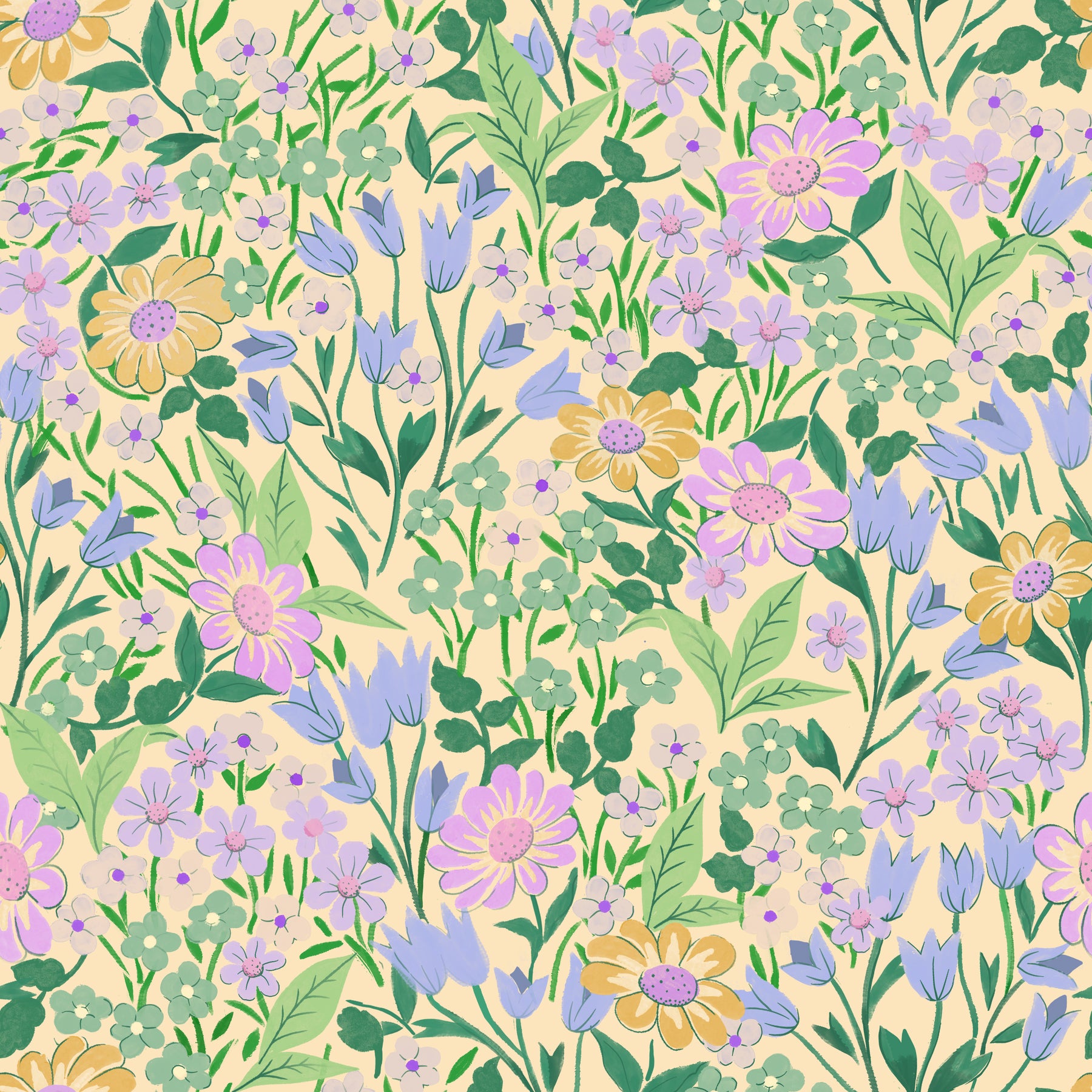 - Motivo: floreale selvatico con un ritmo morbido e pittorico