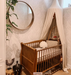 Inför vintagecharm och modern säkerhet i ditt barnrum med denna ljusa valnötsspjälsäng som växer med ditt lilla barn - från nyfödda kramar till självsäkra småbarns dagar - tillverkad i EU för hållbar kvalitet och trygghet i vardagen.