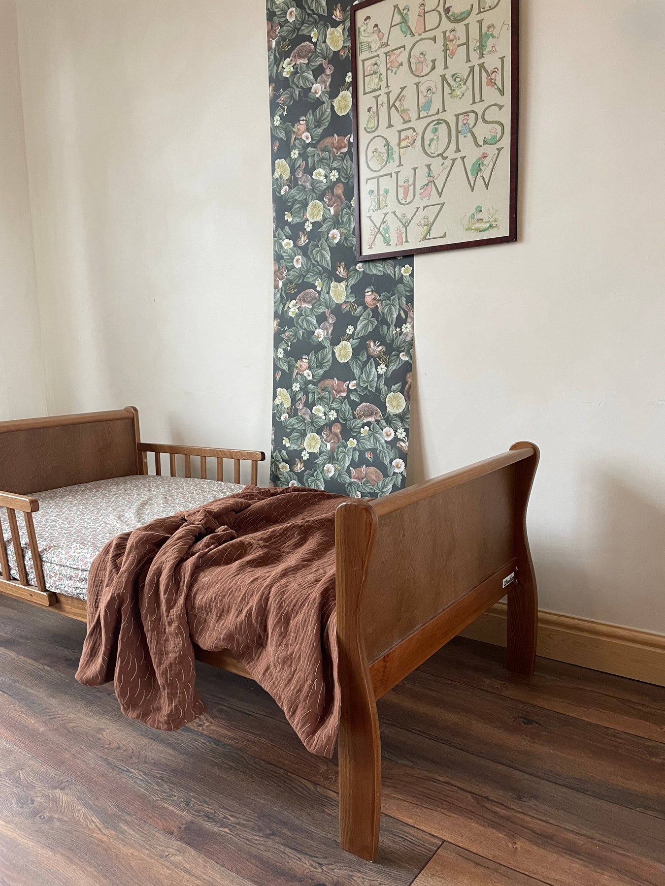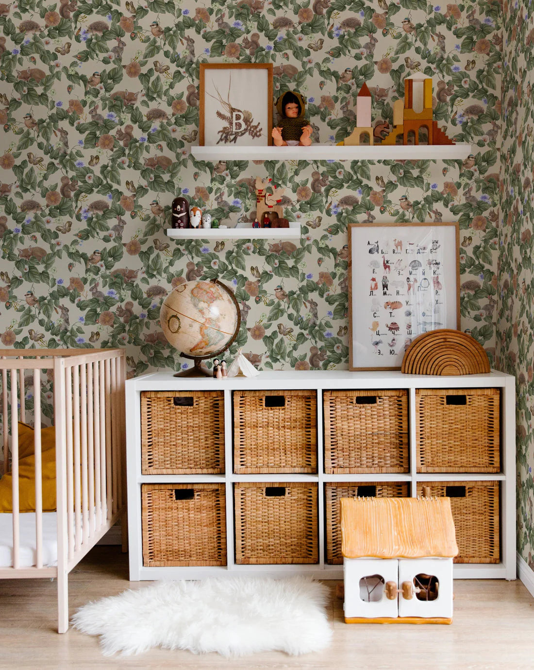 Bjud in en mild skogdröm till ditt barnrum med denna botaniska tapet fylld av vilda blommor, löv, prästkragar, klöver och vänliga skogsvänner - skapad för att förvandla ett barnrum till en magisk, lugnande oas.
